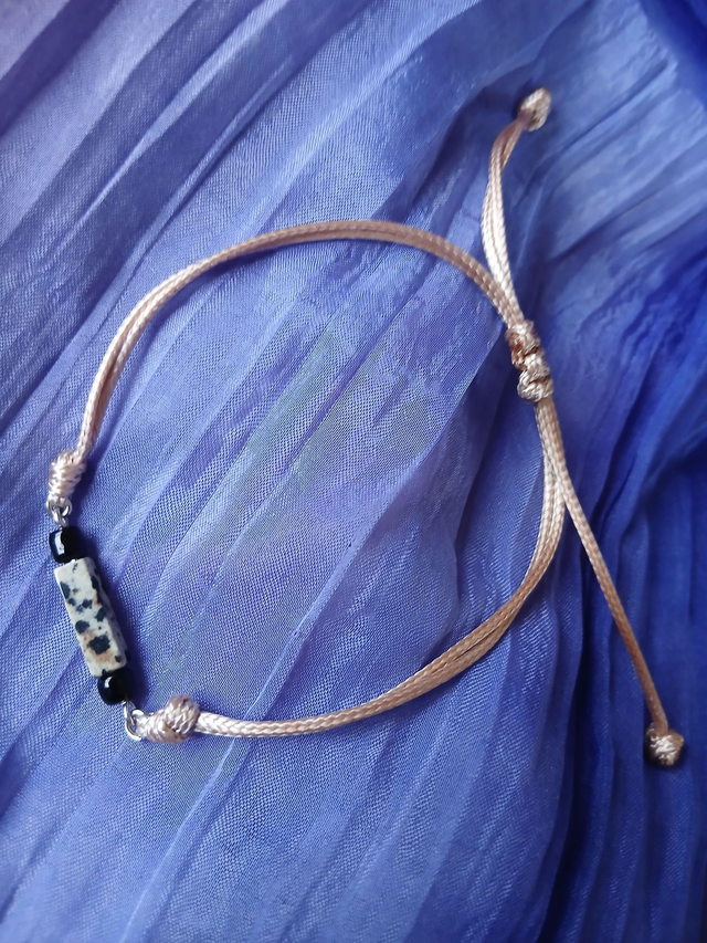 Bracelet upcyclé - Pièce unique - Lacet beige et perle minérale beige mouchetée noir et gris