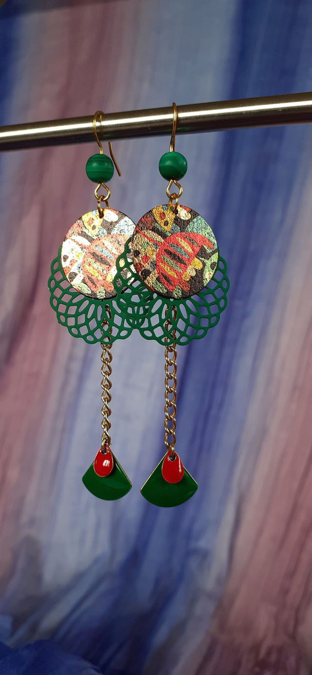 CDC-Upcycle. Boucles d'oreilles pendantes, perle bicolore en acrylique, ton vert émeraude, disque émaillé forme rosace, disque peinture émaillée polychrome, vert et rouge, breloque forme fuseau, ton rouge vif, tige, chainette et breloques en cuivre doré.
