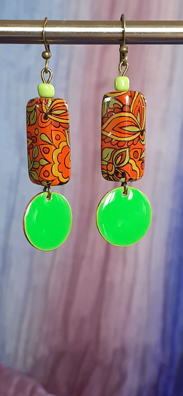 Boucles d'oreilles colorées, perles mérouflées de papier motif floral ton verts et orangés, aspect brillant, breloques émaillées ton vert perroquet, éléments métalliques en acier inoxydable aspect bronze antique.