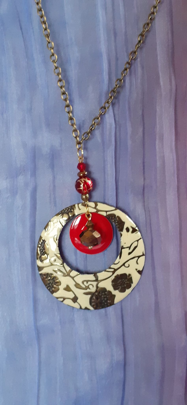 Collier avec pendentif, disque en bronze émaillé ton blanc cassé, motif floral, breloques en bronze émaillé ton rouge vif brillant, perle de verre à facettes, métallisée doré, perle de verre ton rouge vif irisé doré. Chainette maille forçat en alliage de fer aspect bronze antique.