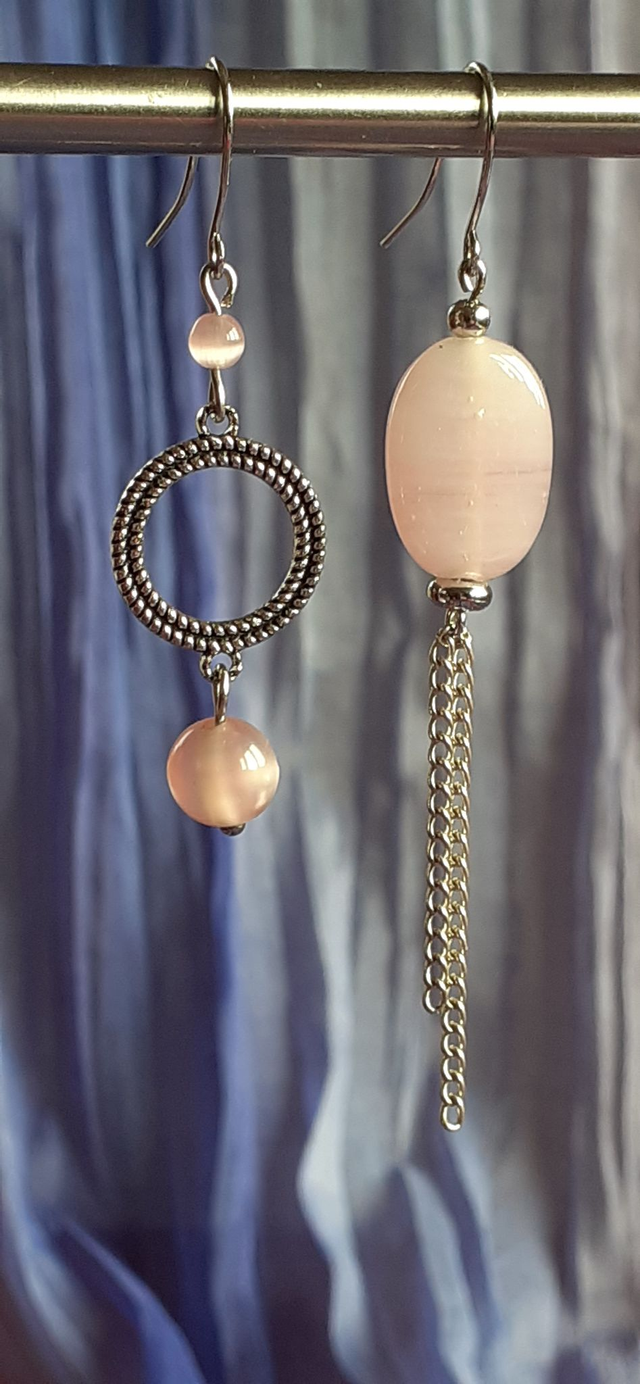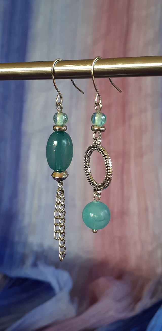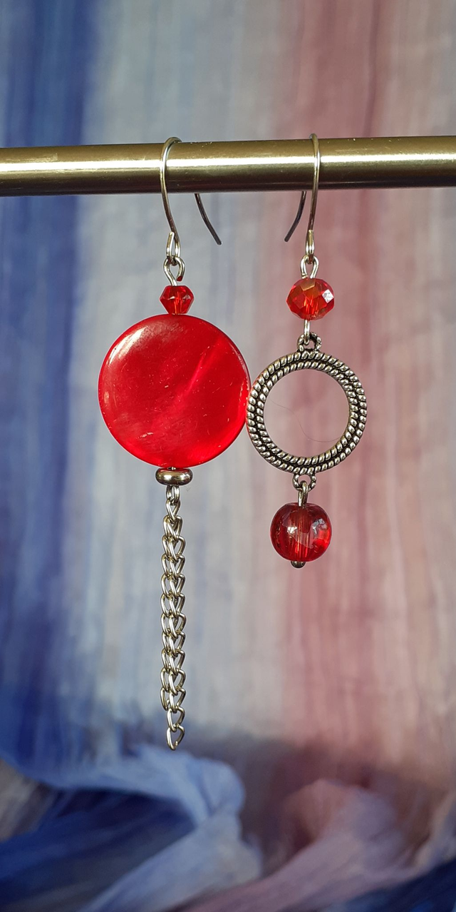 Boucles d'oreilles pendantes asymétriques, perles de verre, breloque chainette et éléments métalliques en acier inoxydable aspect argenté. Divers coloris disponibles, Roses, Bleu canard, Bleu azur, Violet ou Rouge,
