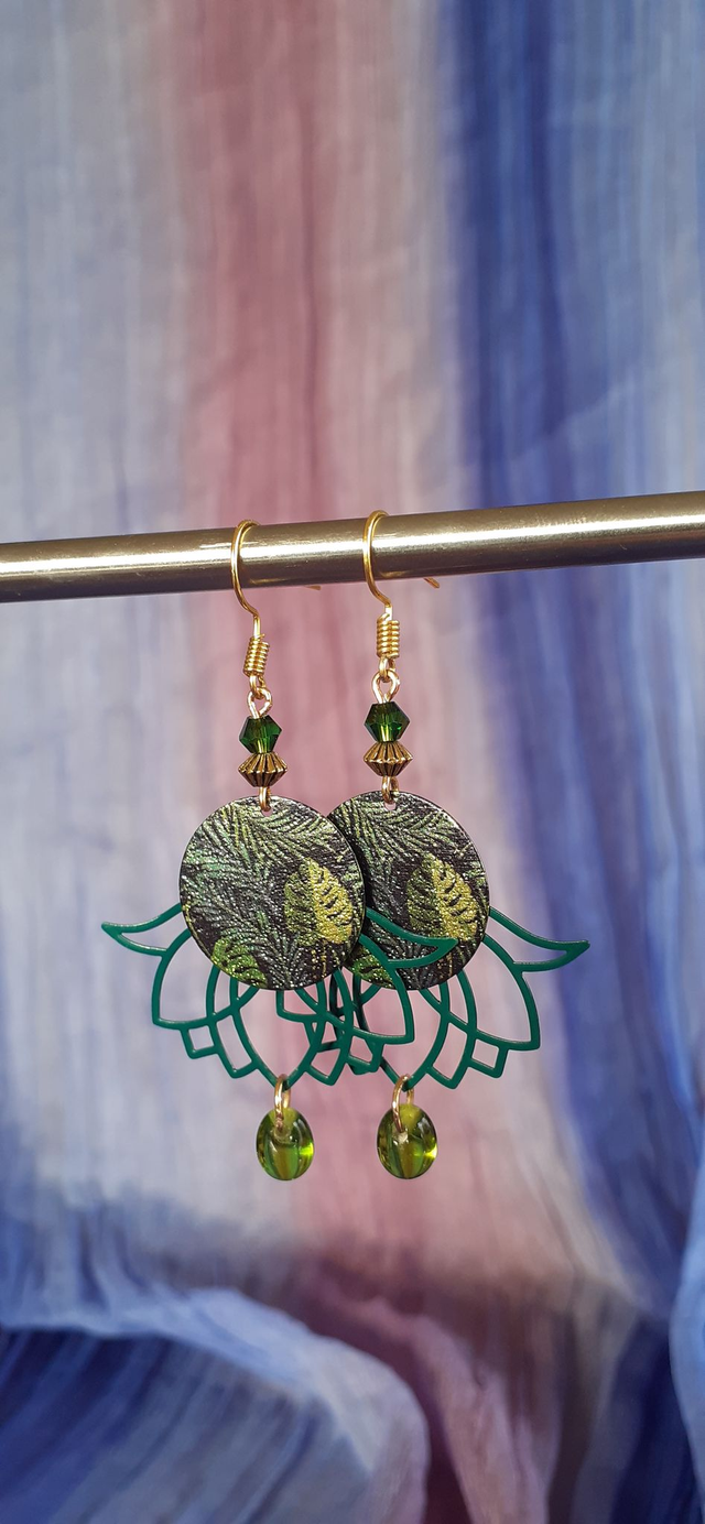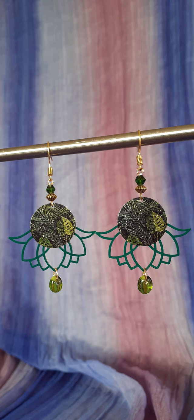 Boucles d'oreilles pendantes, crochet dormeuse, pièce émaillée forme lotus, ton vert bouteille, disque imprimé vert motif feuillage, Goutte de verre, tige et crochet en zinc ton bronze antique.