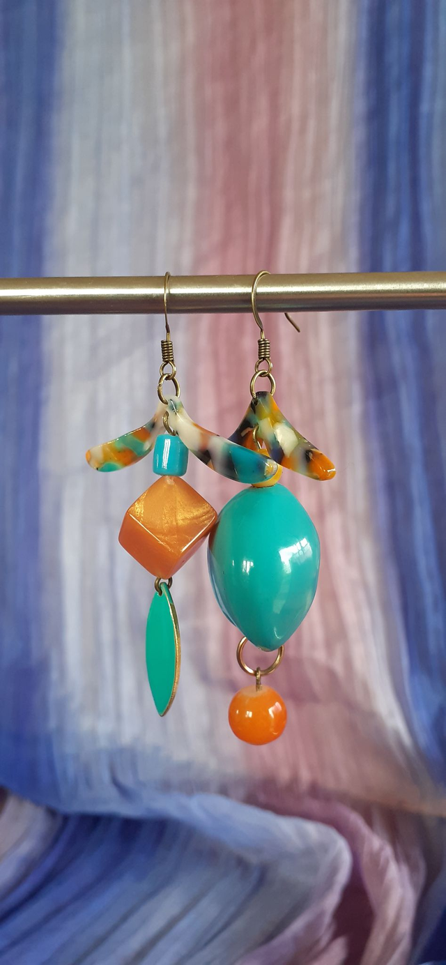 Grandes Boucles d'oreilles pendantes, Perle acrylique forme cubique, couleur orange, perle creuse forme cœur couleur bleu paon, ailettes polychromes orange, bleu et noir, tige et crochet en bronze antique.