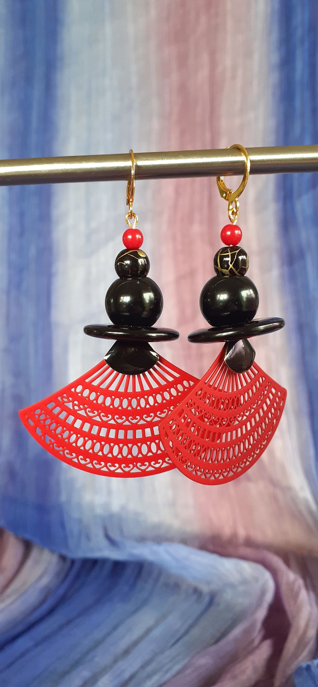 Grandes Boucles d'oreilles, Diverse perles noires, breloque forme éventail de couleur rouge. Montée sur fermoir dormeuses en métal doré.