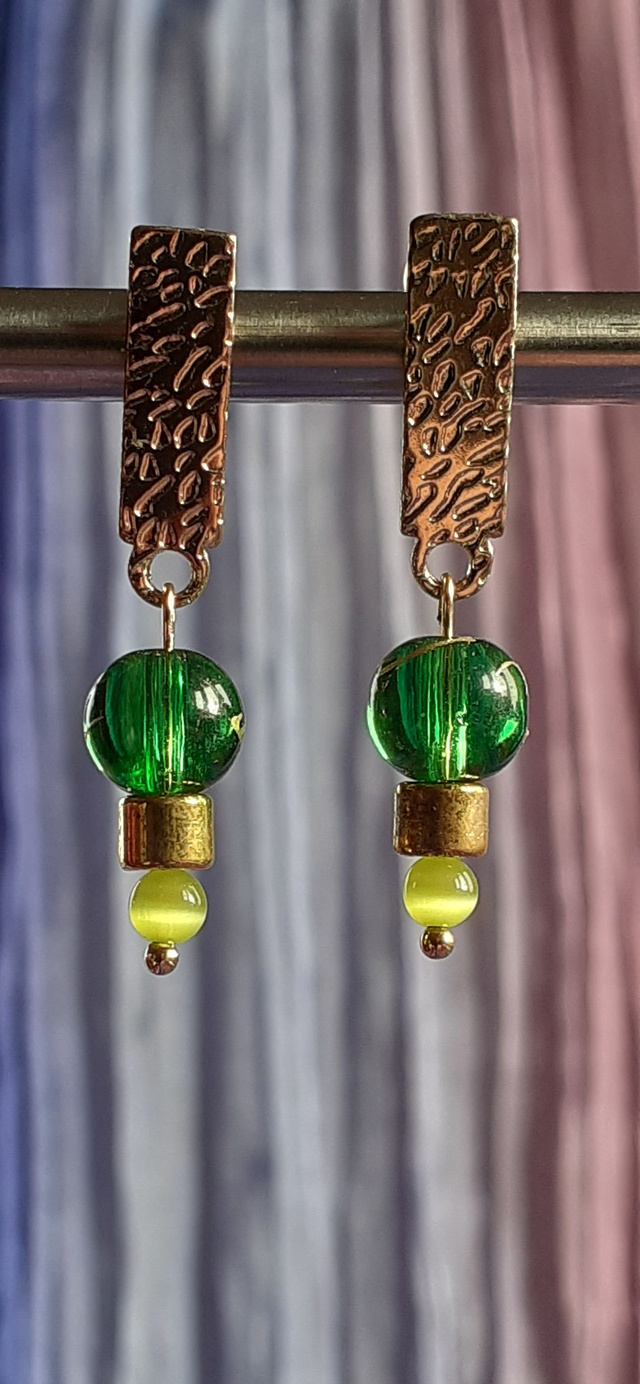 Boucles d'oreilles pendantes dorées, perle de verre de couleur verte irisée de dorures, éléments métalliques en acier inoxydable aspect doré. Taille : 3,9 cm Poids : 8 g