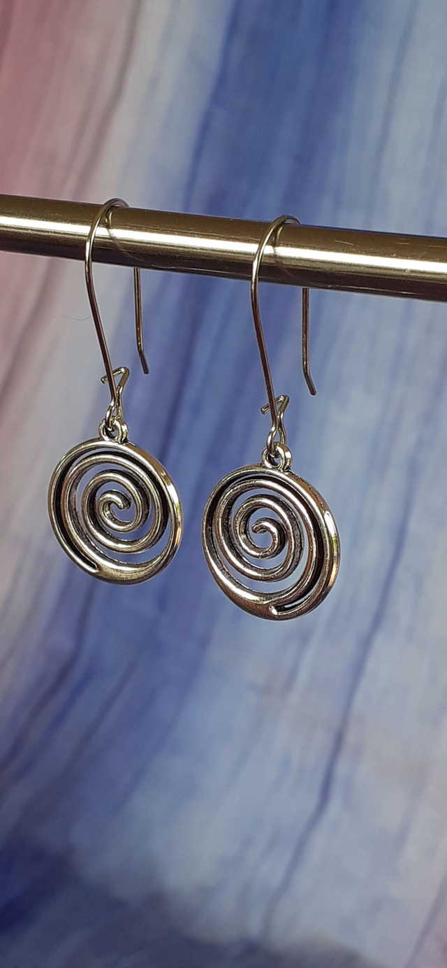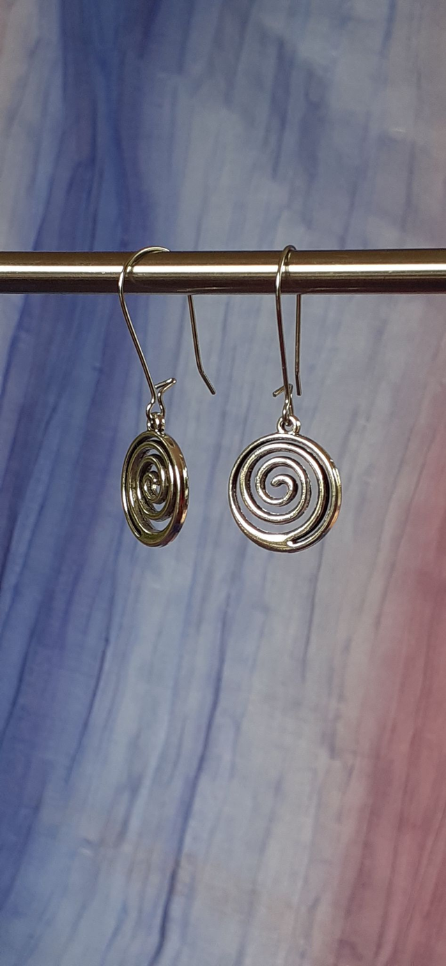 Boucles d'oreilles argentées, breloque forme spirale, montée sur long crochet type dormeuse. Acier inoxydable.