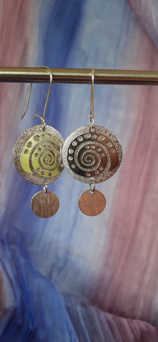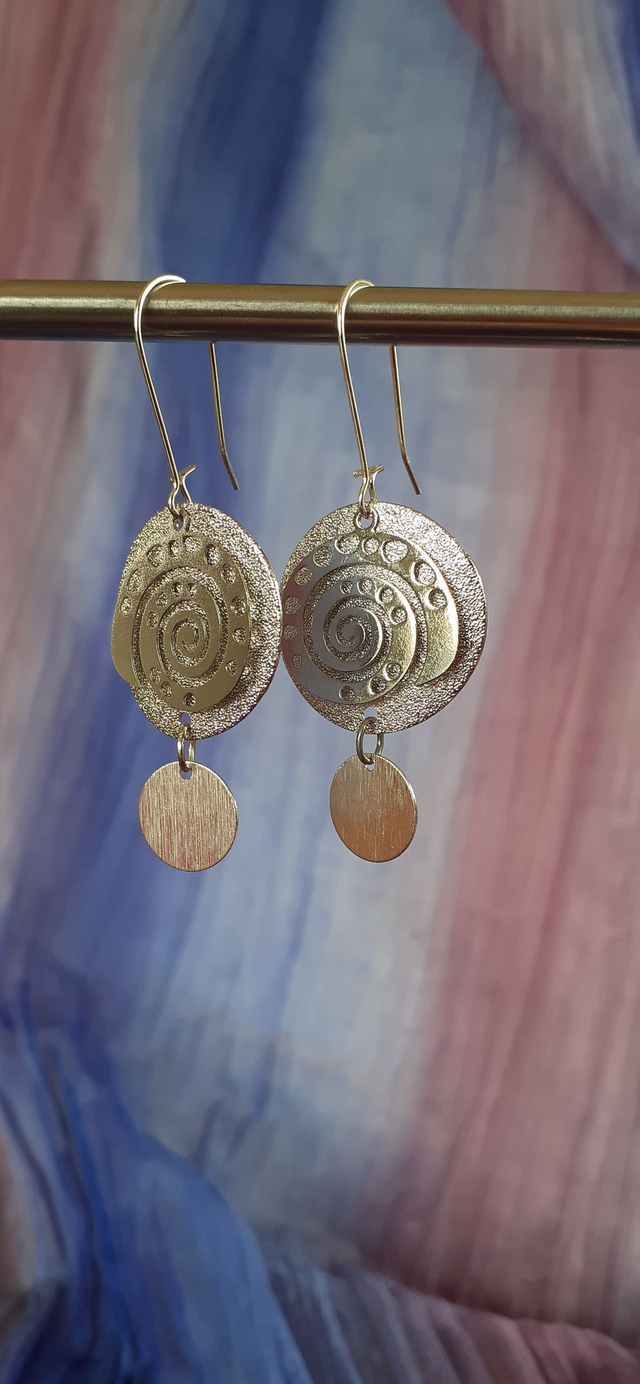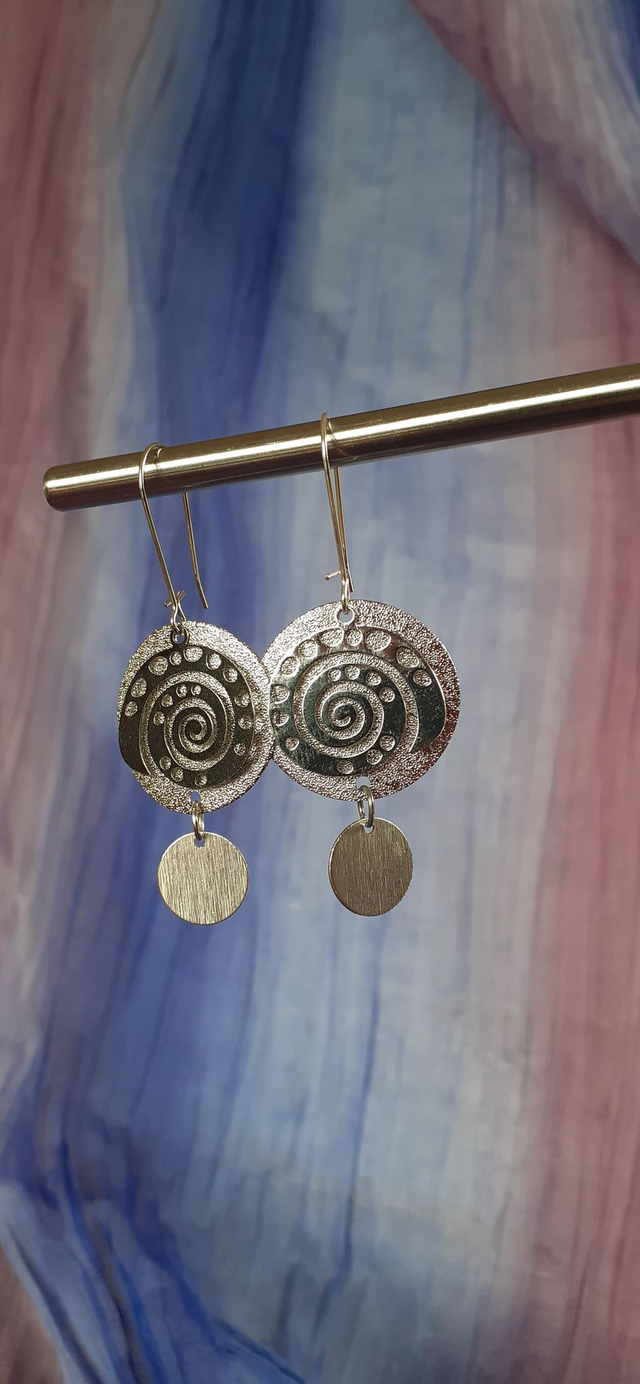 Boucles d'oreilles pendantes argentée. Breloque spirale sur disque sablé. Montées sur long crochet dormeuses.