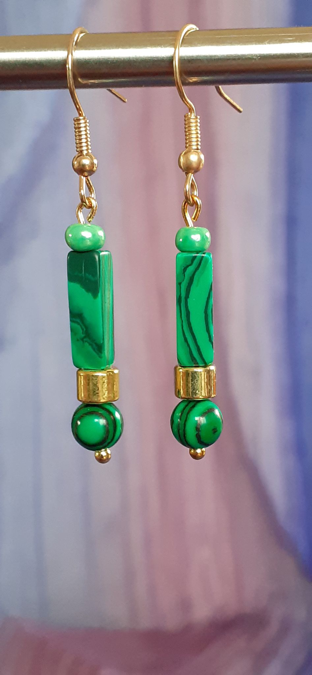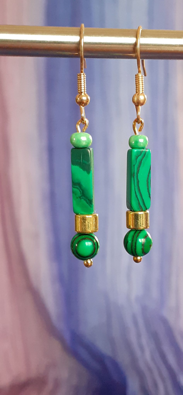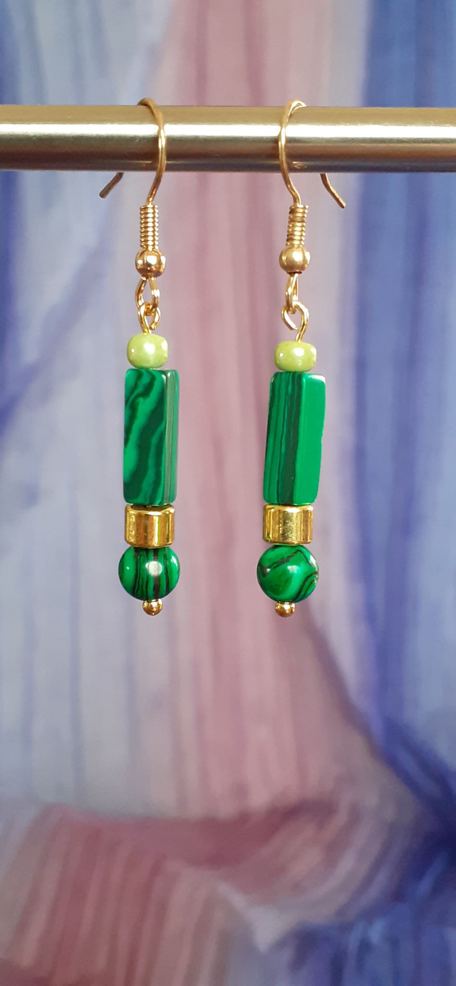 Boucles d'oreilles courtes, perle acrylique forme ronde et forme paralellélépipédique ton vert bouteille marbré ton vert gazon, Breloque en zinc ton doré.Crochet, tige et breloque en alliage de zinc ton doré.