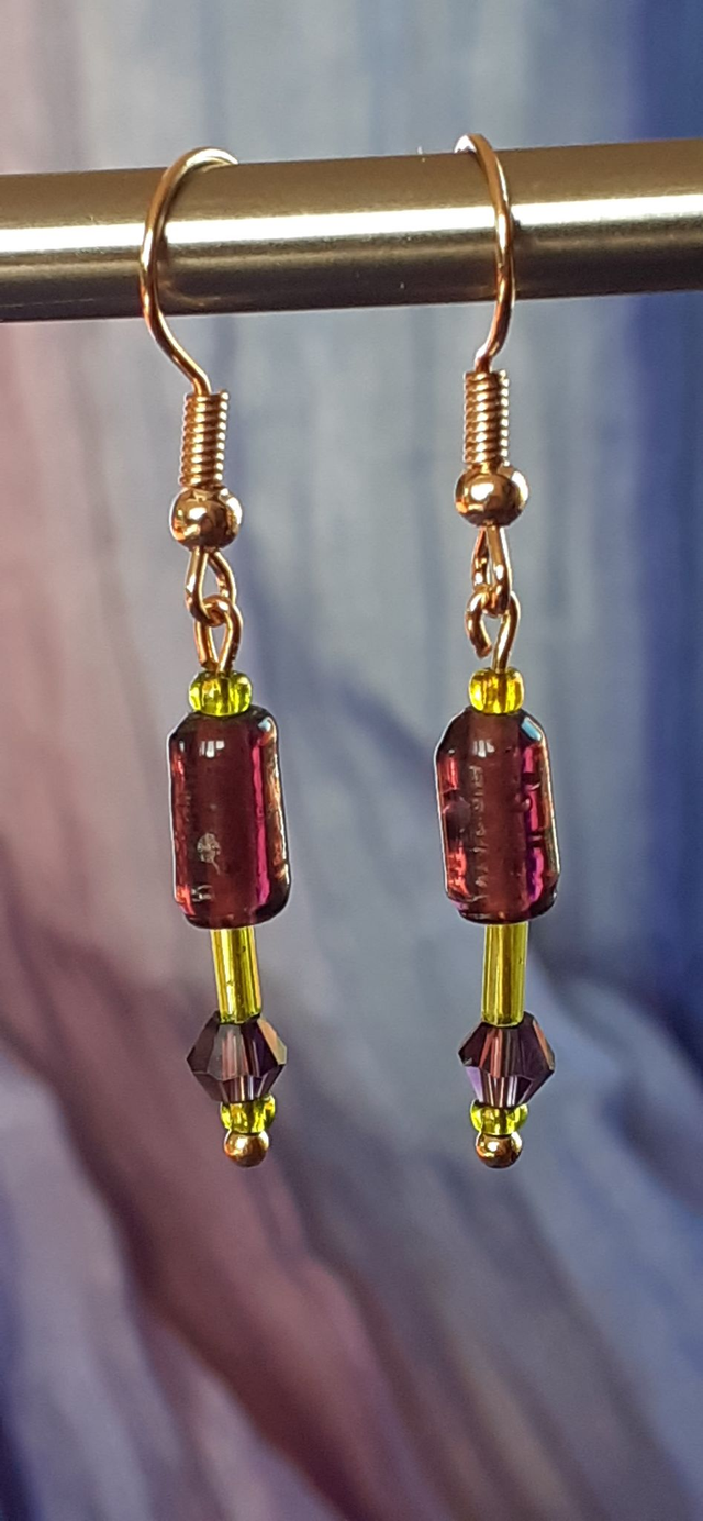 Boucles d'oreilles courtes, perle de verre forme cylindrique, ton violet, perle de verre forme toupie ton violet, perle de verre forme tige ton vert anis.