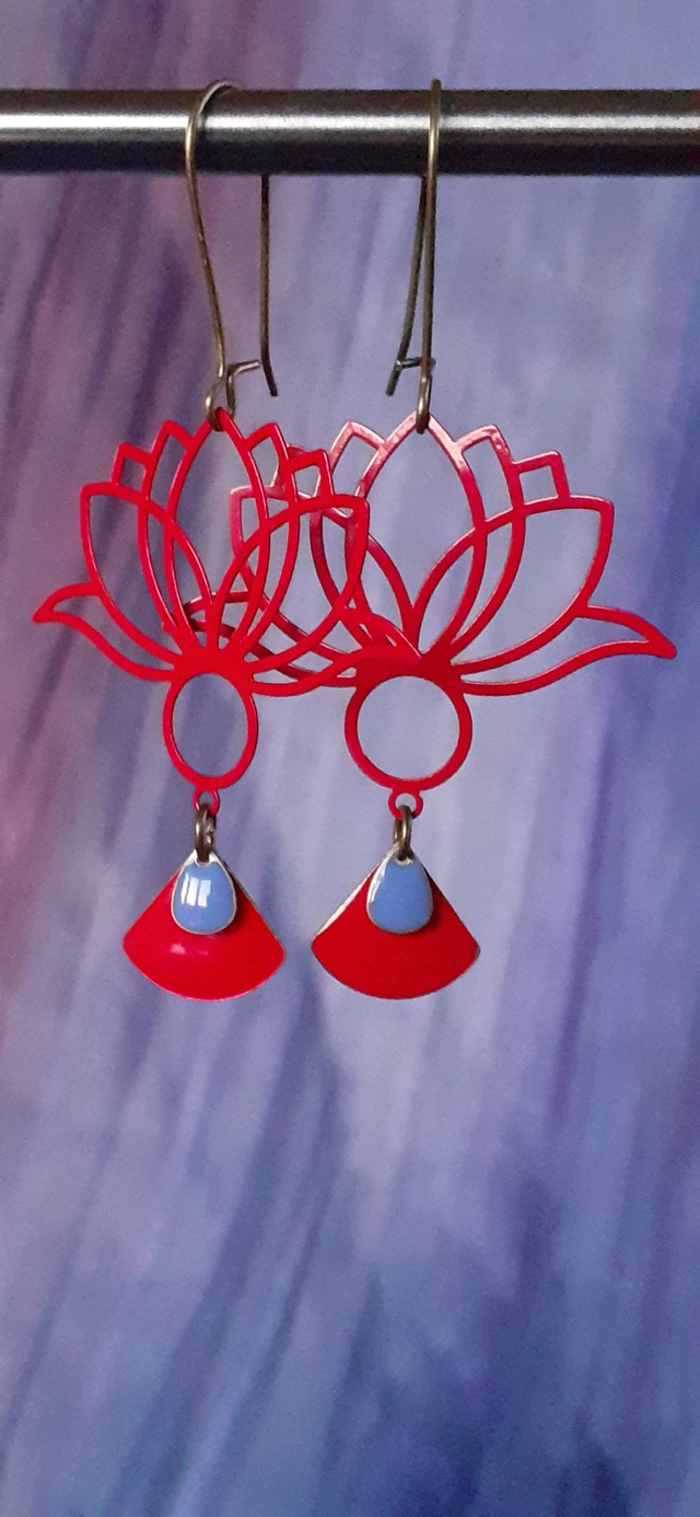 Boucles d'oreilles pendantes, crochet forme fer à cheval, pièce émaillée forme lotus, ton rouge vif, breloque forme éventail, métal émaillé ton rouge vif, breloque forme goutte, métal émaillé ton bleu maya, tige et crochet en zinc ton bronze antique.
