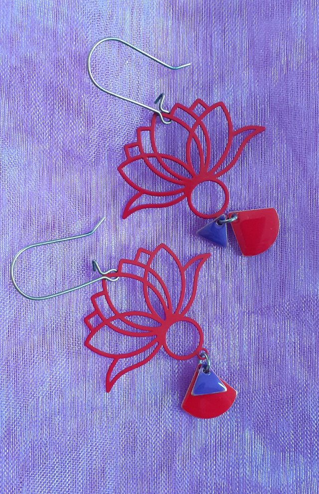 Lotus Boucles d'oreilles, métal émaillé Rouge & Violet