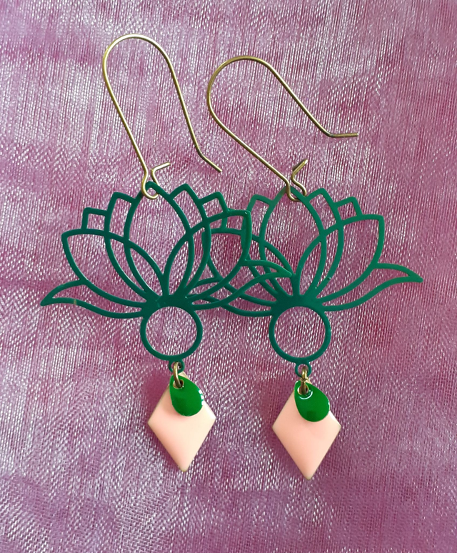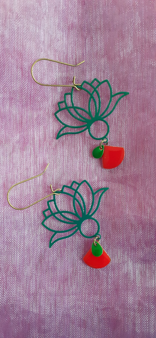 Lotus Boucles d'oreilles, métal émaillé Vert & Rose