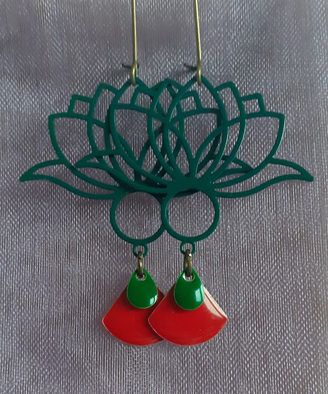 Boucles d'oreilles pendantes, crochet forme fer à cheval, pièce émaillée forme lotus, ton vert bouteille, breloque forme éventail, métal émaillé ton rouge vif, breloque forme goutte, métal émaillé ton bleu maya, tige et crochet en zinc ton bronze antique.