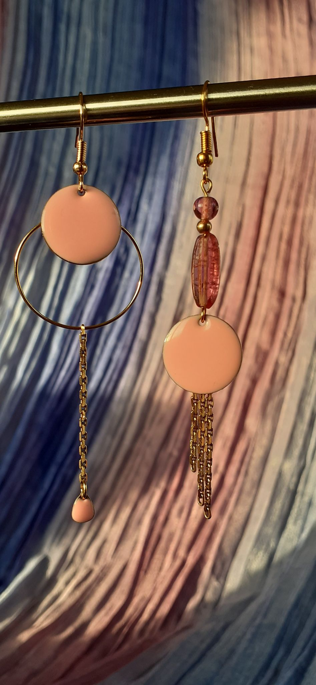 Boucles asymétriques, perles de verre ton rose pêche, breloques émaillées ton rose incarnadin, éléments métalliques, crochets, tiges, chainette en acier inoxydable doré.