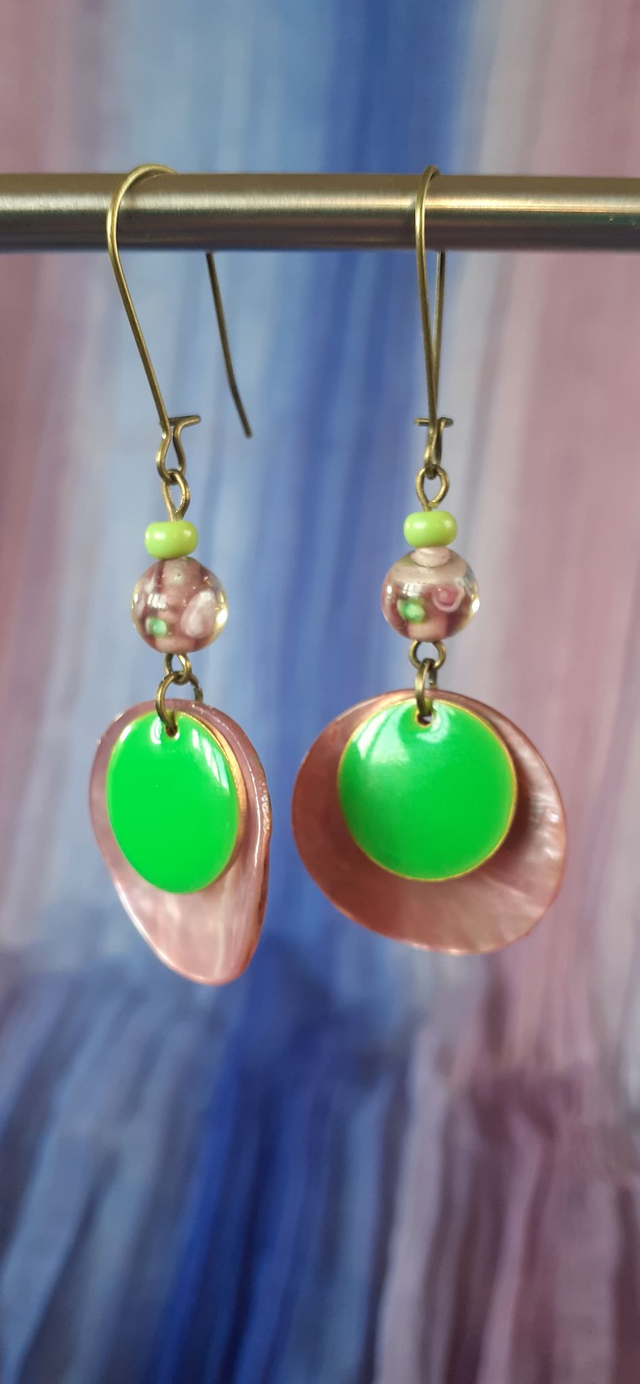 Boucles d'oreilles pendantes, breloque émaillée vert perroquet sur disque de nacre rose, petite perles de verre, éléments métalliques bronze antique.