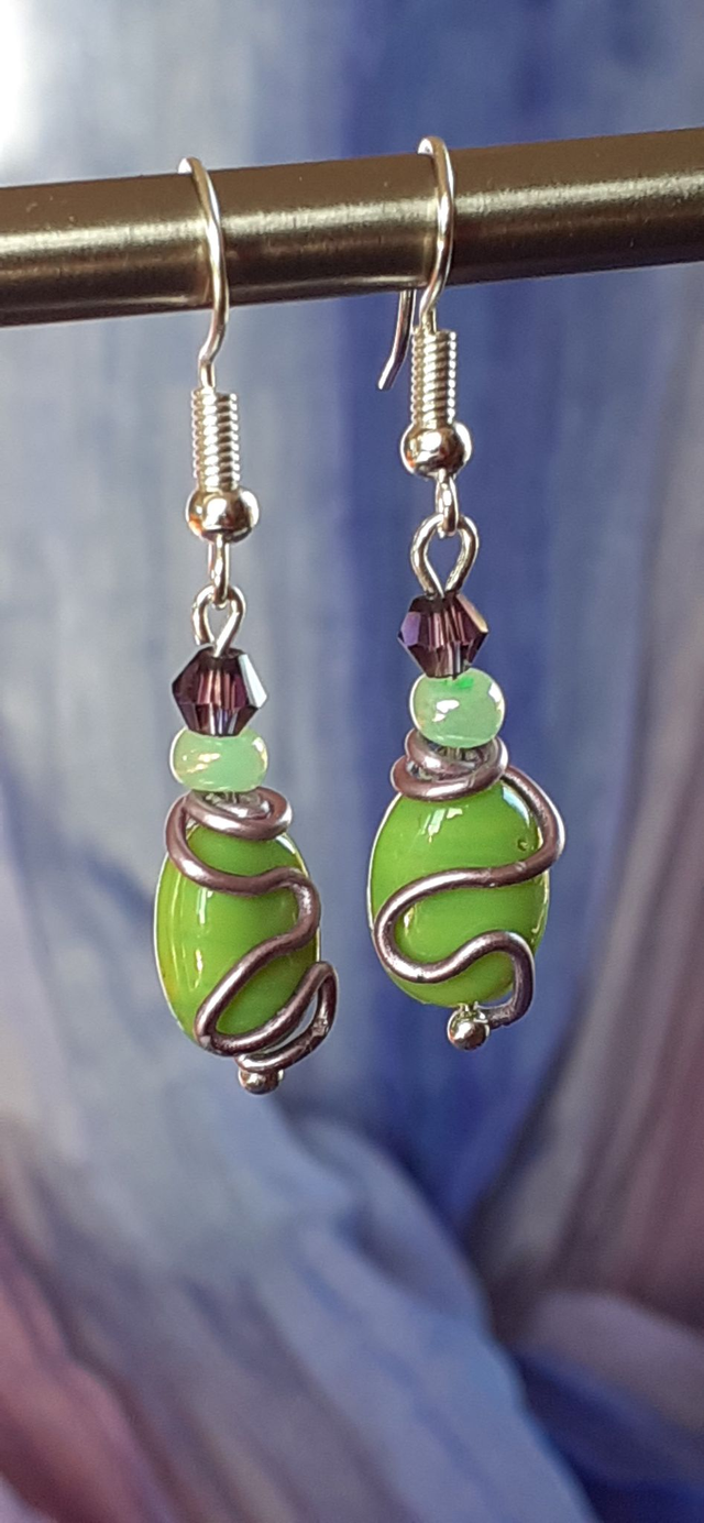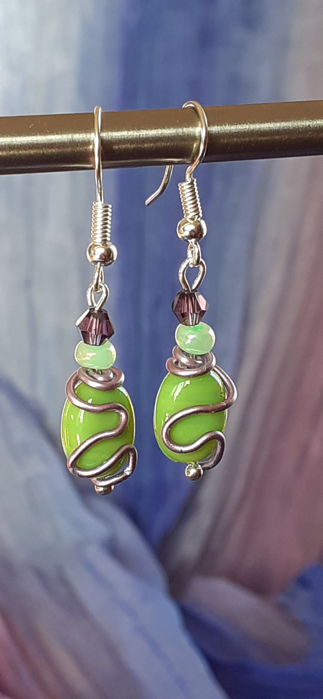 Petites boucles d'oreille, perles de verre ton vert anis. Perle de verre forme toupie ton violet.