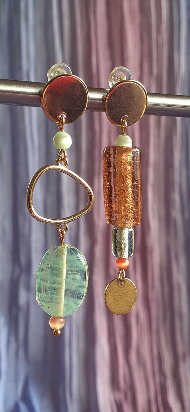 Boucles d'oreilles pendantes asymétriques, perle de verre ton vert d'eau et pêche, attache type clou, éléments métalliques dorés.