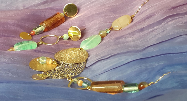 Pesca Parure. Collier doré, forme plastron, ton pêche & vert d'eau, Boucles d'oreilles pendantes asymétriques