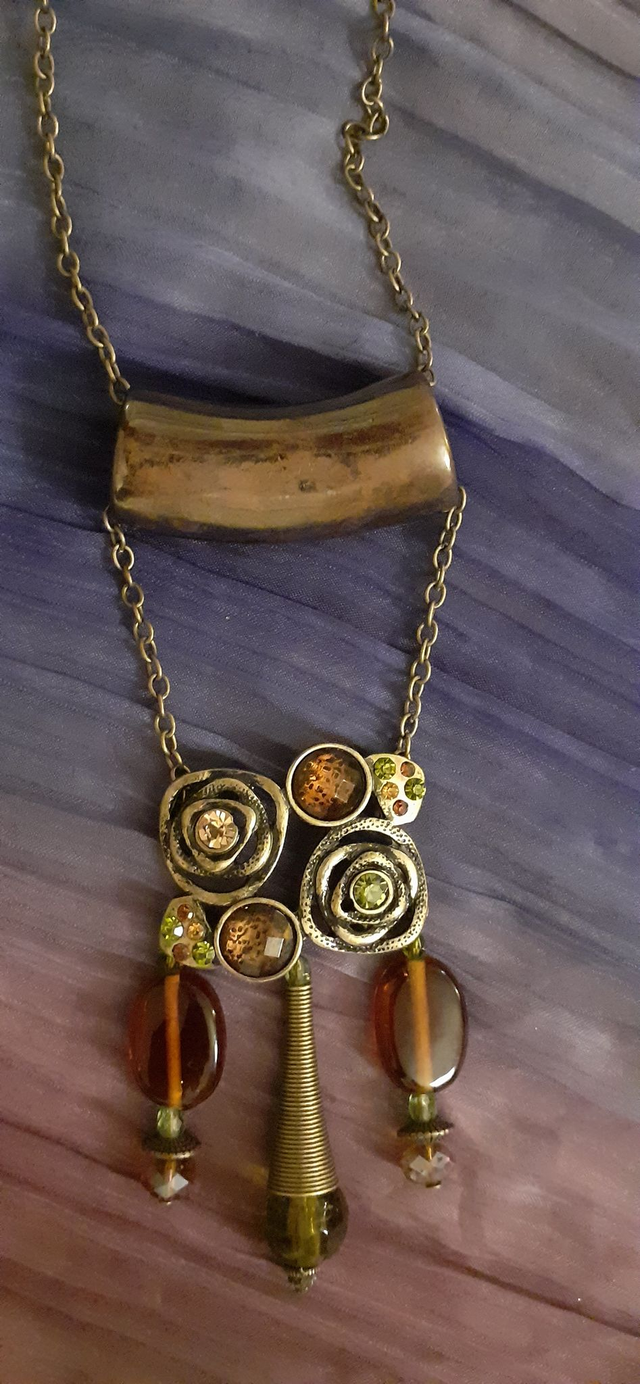 Collier avec pendentif avec cabochons sur support en bronze, breloques de perles de verre ton ocres rouges et ocres jaunes, perle de céramique reflets métallisés. Chainette maille forçat en alliage de fer aspect bronze antique.