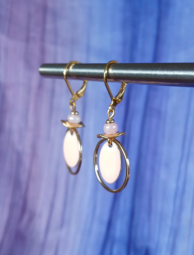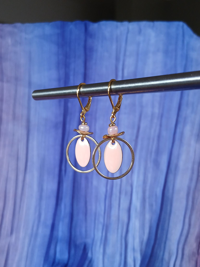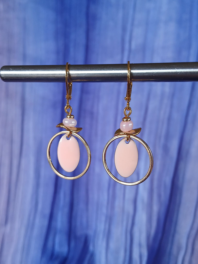 Boucles d’oreilles dorées, rose, légères, lumineuses et parfaites pour un look féminin et singulier.