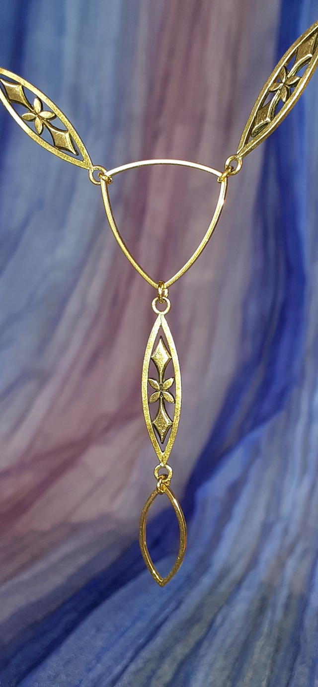 Collier doré, anneaux filigranés forme fuseau, chainette maille cheval, éléments métalliques en acier inoxydable doré.