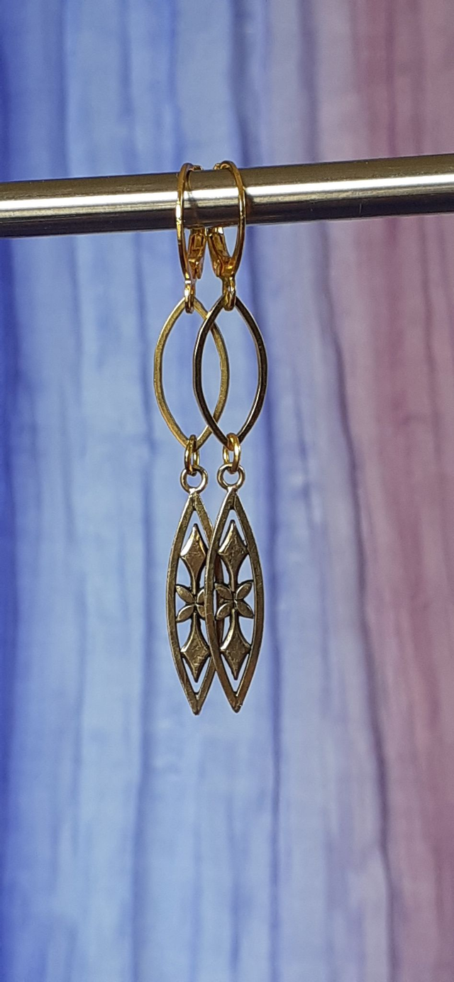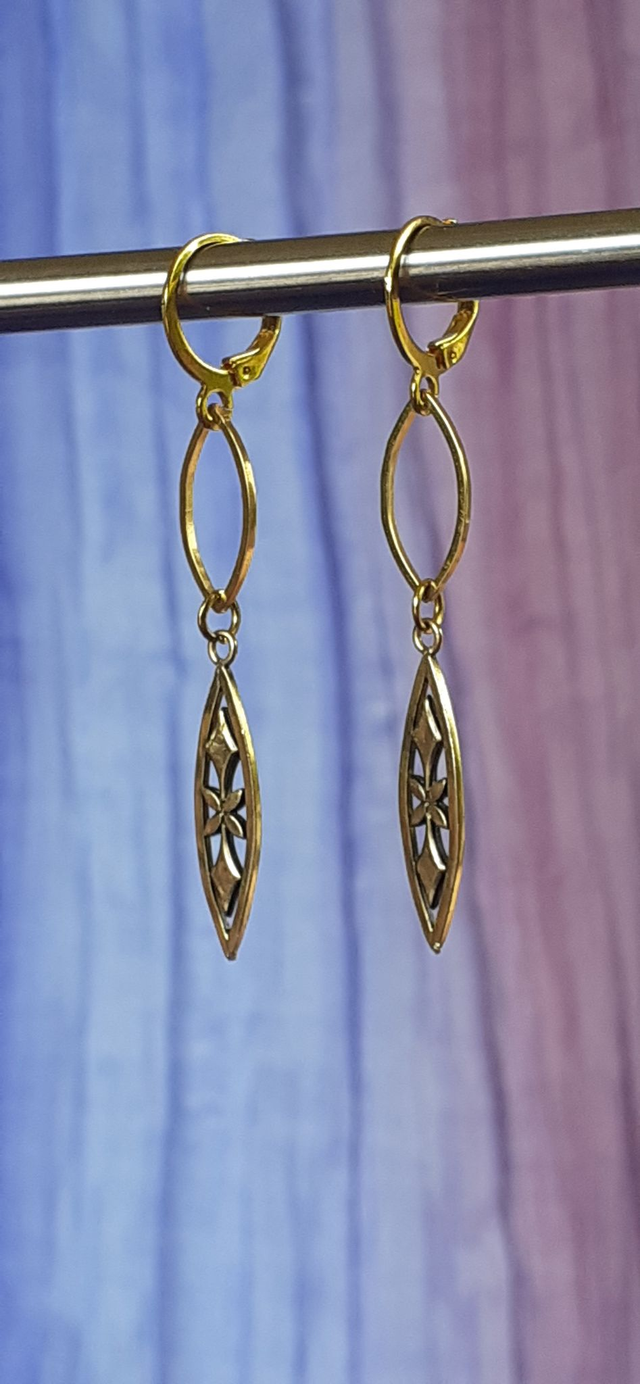Boucles d'oreilles : boucles pendantes dorées, anneaux filigranés forme fuseau, fermoirs dormeuses.