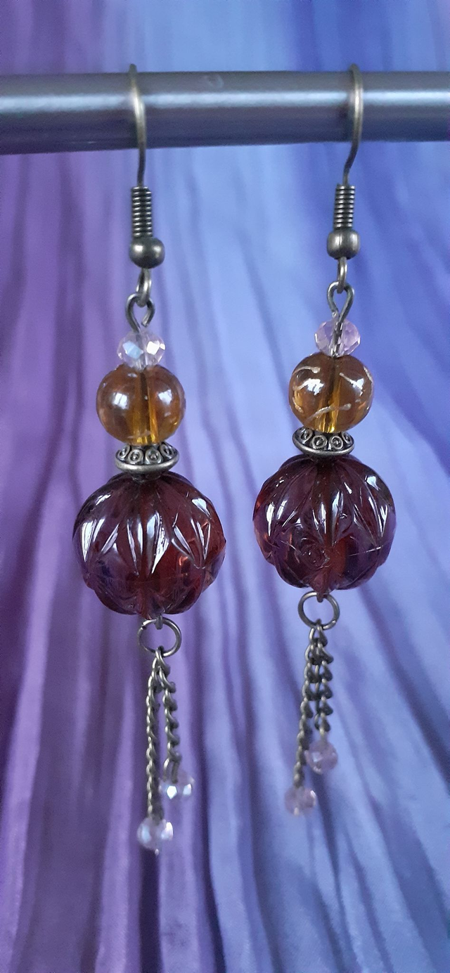 Boucles d'oreilles, alliage de zinc aspect bronze antique, perle en matière plastique, forme ronde entaillée, ton brun, perle de verre ton ocre marbrée de dorure, breloque, tige, chainette et crochet en alliage de zinc aspect bronze antique.