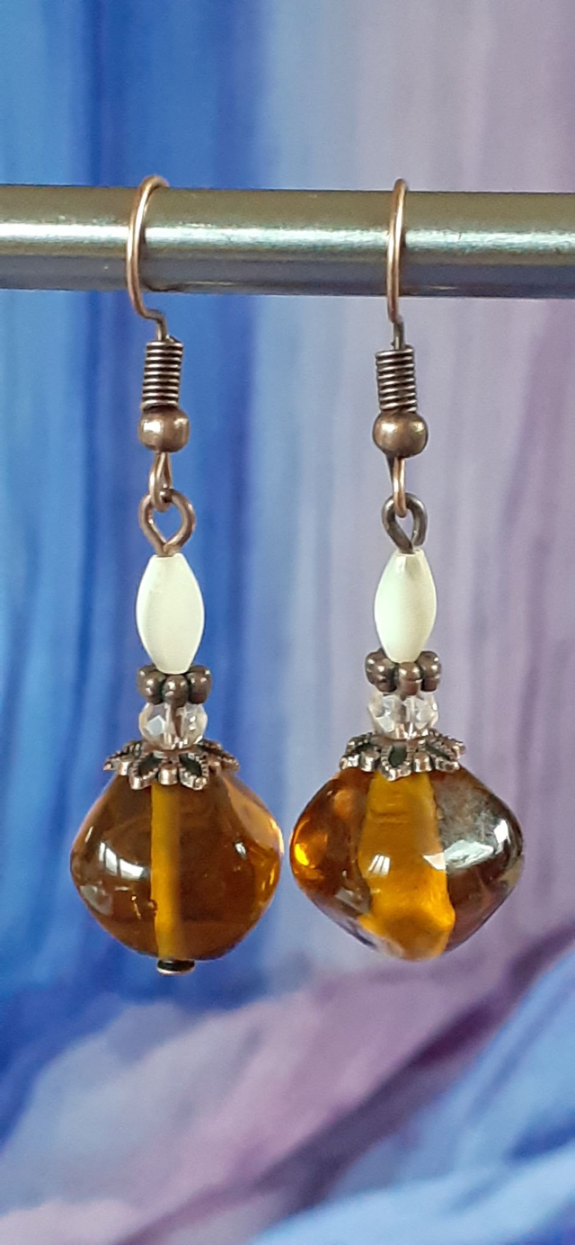 Boucles d'oreilles, perles de verre ton ambre, perle de nacre forme fuseau ton blanc cassé, éléments métalliques en cuivre rouge antique.