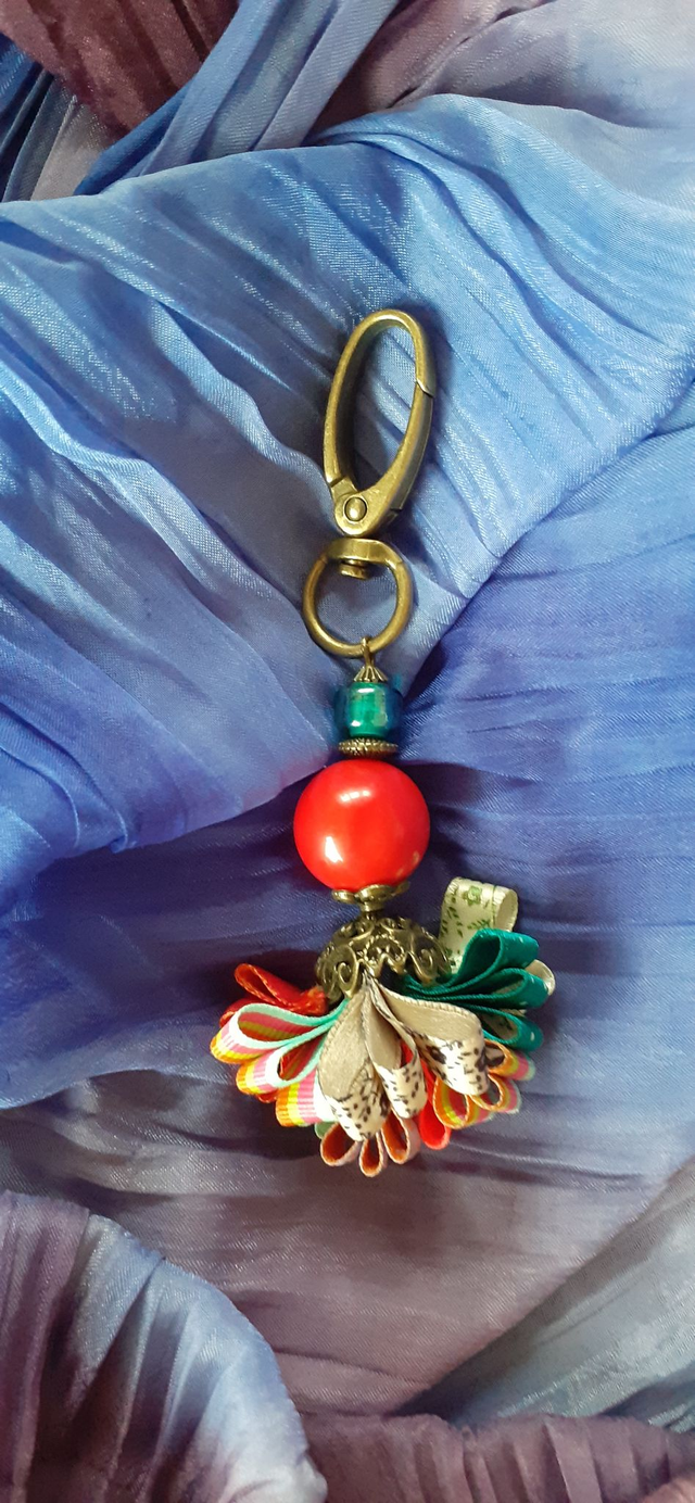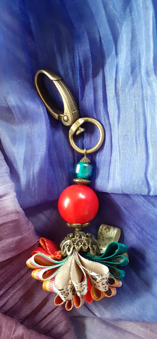 Bijoux de sac à main, Rouge vif & Bleu canard, perles de verre et acrylique, bleu canard et rouge vif, breloques et mousqueton en bronze antique, rubans plissés divers coloris et motifs. Taille : 10,5 cm Poids : 21 g